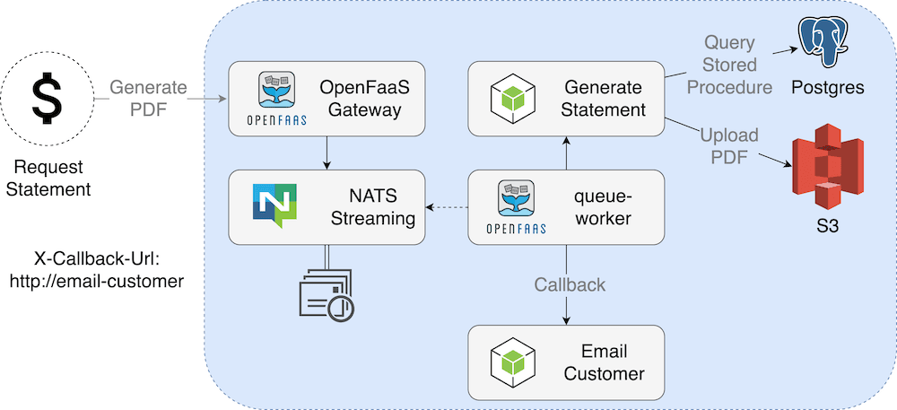 - Async functions. OpenFAAS enables long-running functions to run in background and allows decoupling the HTTP transaction between the function and the caller.